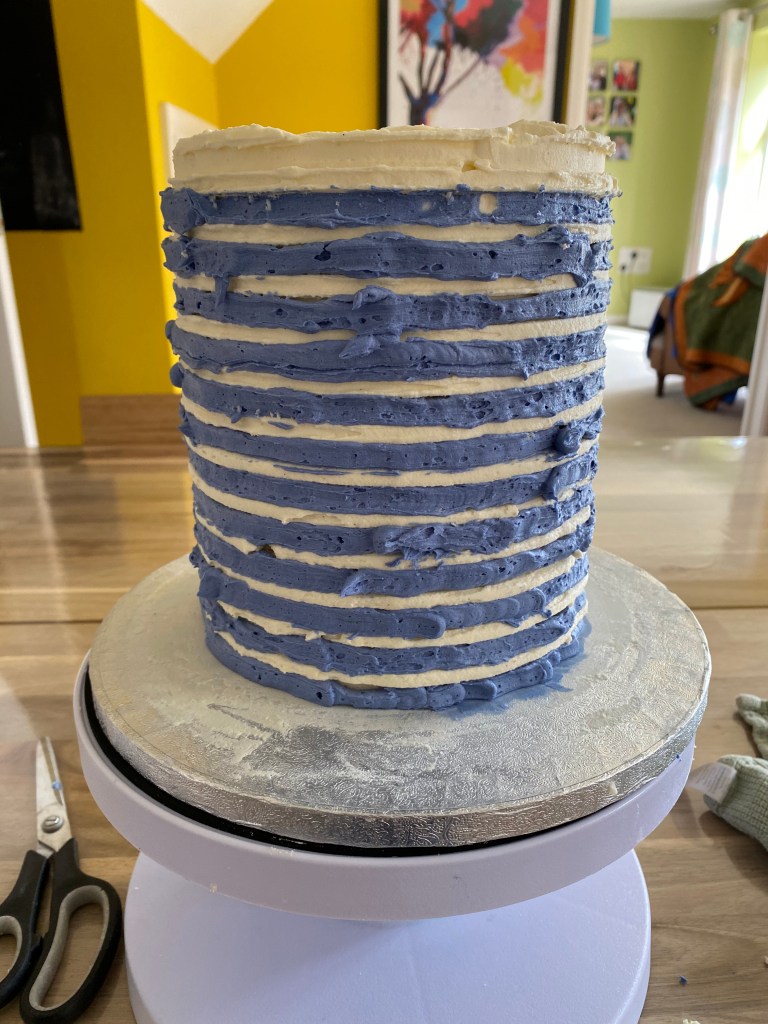 Once the cake was iced completely with the white vanilla buttercream, I picked up my square ridged scraper and began creating the gaps on the cake for the blue buttercream. It was so much fun spinning and scraping, I was in the zone ready to create my masterpiece. With mild trepidation in my heart I put it in my cake fridge and set a timer for ten minutes as per the instructions of my research.
